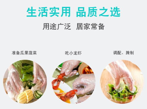 用途:一次性PE手套多用于家庭清潔,化學檢驗,機械園藝,食品、衛(wèi)生及工農(nóng)業(yè)防護,染發(fā),護理洗滌,用餐(如吃龍蝦,大骨頭)等等,佩戴可免去洗手之不便。